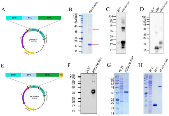 Modification of the EDIII ferritin construct for stable expression. (A) EDIII linked to the ferritin gene through the SSG linker was cloned into MCS 1 of the pACYCDuet-1 vector. (B) The expression of the EDIII ferritin was analyzed by SDS-PAGE (upper arrow—expected band; lower arrow—resulting major band). (C) Blotted EDIII ferritin was detected with an anti-His antibody to identify the cleavage of EDIII and ferritin. (D) Blotted EDIII ferritin was detected using an anti-DENV2 EDIII antibody to confirm the cleaved EDIII of the full construct. (E) A modified plasmid was generated, including an additional 6-histidine tag in the C-terminal of EDIII ferritin. (F) Complete EDIII ferritin protein of the expected size was detected in the Western blot membrane treated with anti-His antibody. (G) A complete expression of EDIII ferritin was confirmed by SDS-PAGE. (H) The purity of the His-purified EDIII and EDIIII ferritin was confirmed by SDS-PAGE before mouse immunization.