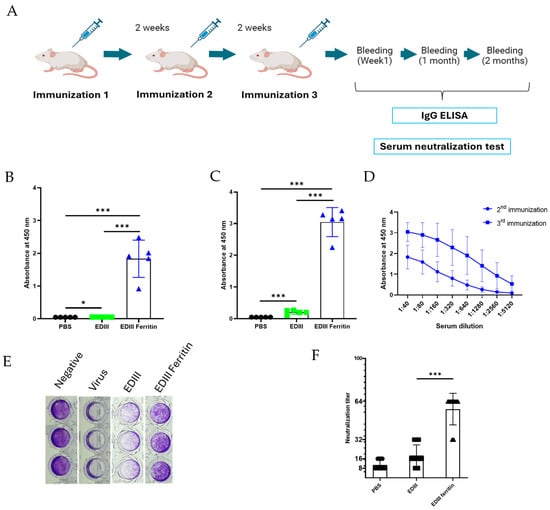 The mouse immunization and bleeding schedules are shown in Figure 5A. Using the serum obtained one week after the second immunization and one week after the third immunization, EDIII-specific IgG ELISA was performed to confirm the specific immunity. After the second immunization, the average absorbance values of the PBS, EDIII, and EDIII ferritin-immunized groups were 0.049, 0.0528, and 1.8328, respectively. This confirmed that EDIII and EDIII ferritin induced significant specific IgG titers compared with the PBS control group, and EDIII ferritin induced significant IgG titers compared with the EDIII-only immunized group (Figure 5B). The ELISA results obtained after the third immunization showed average absorbance values of 0.05, 0.20, and 3.0, respectively, for the PBS, EDIII, and EDIII ferritin groups (Figure 5C). The average absorbance values of EDIII and EDIII ferritin were comparably higher than the absorbance values obtained from the second immunization, and both EDIII and EDIII ferritin induced significant IgG titers compared to the PBS group. Total IgG responses at both time points indicated that EDIII ferritin induced a significant IgG titer compared to the EDIII group. Furthermore, a comparison of IgG responses from the second and third immunizations of EDIII ferritin at each serum dilution showed that the third immunization produced significant IgG titers compared to the second immunization (Figure 5D).