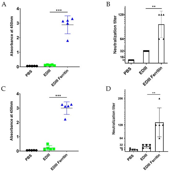 Immunization of mice with purified DENV2 EDIII ferritin nanoparticles induced a significant immune response against DENV compared to EDIII alone. To compare the immunostimulatory activity of the monomers and multimers in the ferritin cage, it is essential to use similar molar ratios rather than a similar amount (µg) of proteins because the volume acquired by one ferritin molecule is not similar to that of the EDIII molecule, delivering a diverse number of protein molecules. Therefore, molar-equivalent immunization has been used in multiple studies related to ferritin nanoparticle vaccines [30,40,41,42].