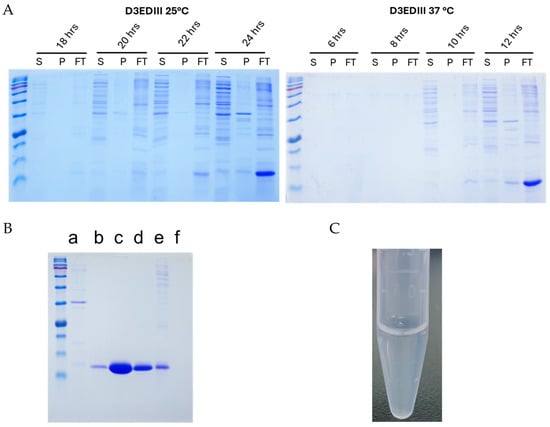 The same E. coli strain (BL21) expressing the EDIII protein was inoculated into 10 mL of LB chloramphenicol medium and incubated overnight at 37 °C in a shaking incubator. Subsequently, 1 mL of the same LB medium was aliquoted into 14 mL round bottom tubes, and 10 µL (1:100 diluted) of overnight culture was added to each tube. One set of samples was incubated at 25 °C and harvested by centrifugation at 5000× g for 5 min at 18, 20, 22, and 24 h after inoculation. Another set was incubated at 37 °C, and the samples were harvested under the same conditions at 4, 6, 8, and 10 h post-inoculation. The samples were prepared according to the 2 M freezing–thawing method, and the expression levels of EDIII in PBS-sonicated supernatant, freezing–thawing pellet, and supernatant were analyzed using SDS-PAGE.