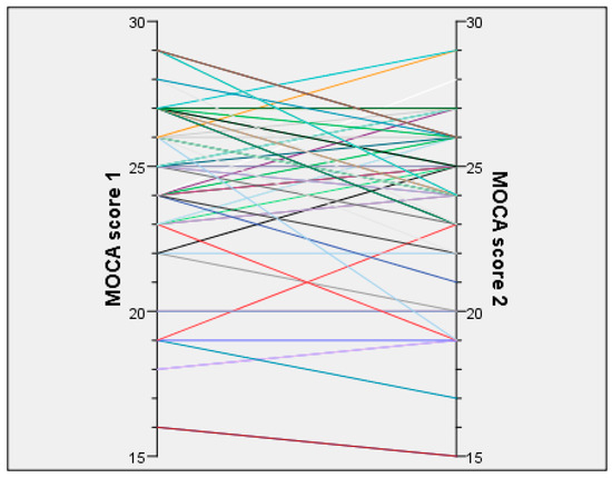 We compared the MOCA test results between the two timepoints (Table 3). We identified a slight improvement in the scores at the second testing (median 24 vs. 25, p = 0.02). Investigating the various sections of the MOCA score, there was a slight improvement in recollection, especially when scored using the memory index (p = 0.002), and there were small overall improvements, albeit not reaching statistical significance in naming (p = 0.083) and orientation (p = 0.083). The changes in the MOCA score for each participant are depicted in Figure 1.