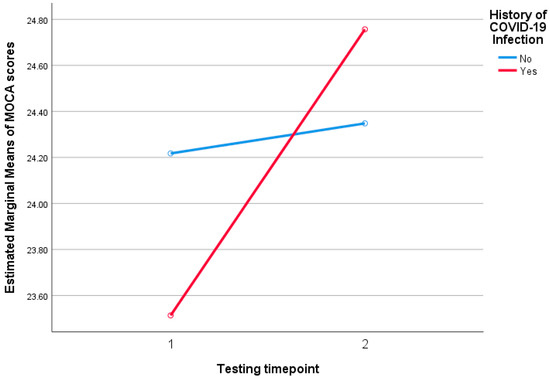 Estimated marginal means of MOCA scores over two timepoints for individuals with and without a history of COVID-19. No significant differences were observed over time, between groups or in the interaction between time and COVID-19 history (all p > 0.05). MOCA: Montreal Cognitive Assessment, COVID-19: coronavirus disease 2019.