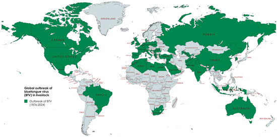 Global outbreak of bluetongue virus (BTV) in livestock from 1876 to 2024.