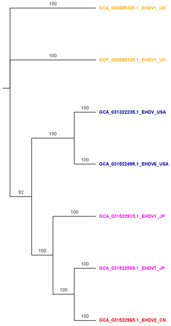 - Qi, Y.; Wang, F.; Chang, J.; Zhang, Y.; Zhu, J.; Li, H.; Yu, L. Identification and complete-genome phylogenetic analysis of an epizootic hemorrhagic disease virus serotype 7 strain isolated in China. Arch. Virol. 2019, 164, 3121–3126. [Google Scholar] [CrossRef]