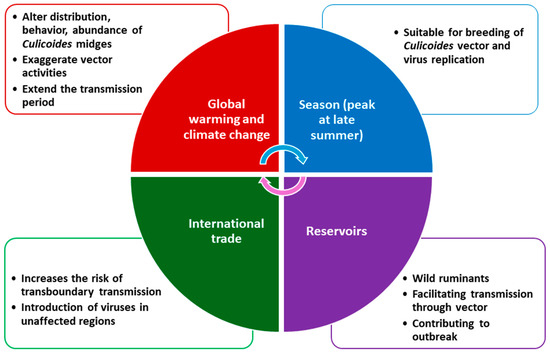In the Netherlands, within-farm transmission of BTV-8 occurred in dairy and sheep flocks during vector season [53], while in France, host movement between distant pastures contributed to the BTV-8 spread in disease-free areas [54]. This serotype caused marked clinical signs and transplacental transmission in cattle and goats [55]. By 2010, an extensive vaccination campaign controlled the outbreak in France [46], although ‘silent circulation’ of the strain continued [56,57], with re-emergence in 2015 [57]. During 2016–2017, the outbreak spread eastward from France, and by 2019, it reached northeast to Switzerland, Germany, and Belgium [58] through movement of infected livestock and Culicoides midges [54]. This clearly demonstrates the risk of BTV for global trade, as importing animals from endemic areas without monitoring and improper quarantine can endanger livestock industries. Recently, BTV-8 was again detected in France in August 2023 and identified as a ‘new strain’ causing severe symptoms and mortality [59].