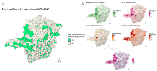 Poxvirus circulation in Minas Gerais associated with agricultural and livestock production. (A) In green municipalities that present at least one indicator of poxvirus circulation according to clinical or laboratory criteria from 2000 to 2023. (B) Municipal mean agricultural and livestock production from 1995 to 2017.