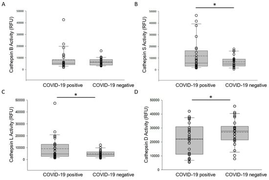 Activity of various cathepsins in urine samples from COVID-19-negative participants and COVID-19-positive participants. (A) cathepsin B activity, (B) cathepsin S activity, (C) cathepsin L activity, and (D) cathepsin D activity in urine samples from COVID-19-negative participants and COVID-19-positive participants. Box and whisker plots show the mean (dotted line) and median (solid line) for the data points. * represents a p-value < 0.05. n = 25 samples per group. RFU refers to relative fluorescence units.