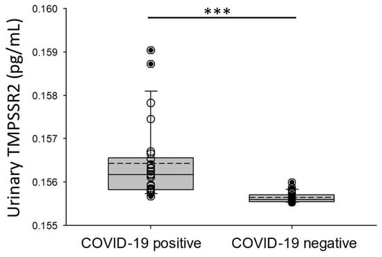 Since the transmembrane serine protease 2 (TMPRSS2) and angiotensin-converting enzyme 2 (ACE2) proteins are involved in SARS-CoV-2 viral entry [16], we investigated whether TMPRSS2 was elevated in the urine of COVID-19-positive participants compared to the urine of COVID-19-negative participants. As shown in Figure 2, there was a greater concentration of TMPRSS2 in the urine of the COVID-19-positive participants compared to the control group.