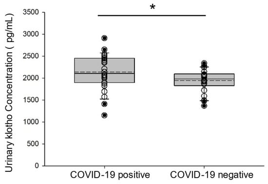 ELISA of Klotho concentration in urine samples from COVID-19-negative participants and COVID-19-positive participants. Box and whisker plot show the mean (dotted line) and median (solid line) for the data points. * represents a p-value < 0.05. n = 25 samples per group.