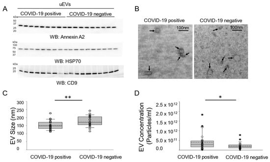 Characterization of uEVs isolated from COVID-19-negative participants and COVID-19-positive participants. (A) Western blot analysis of the uEV markers annexin A2, HSP70, and CD9; n = 9 per group; (B) representative transmission electron microscopy micrographs of uEV preparations from the COVID-19-negative and COVID-19-positive participant groups; (C) nanoparticle tracking analysis showing a difference in size of the uEV preps from the two groups; and (D) nanoparticle tracking analysis showing a difference in concentration of the uEV preps from the two groups. Box and whisker plots show the mean (dotted line) and median (solid line) for the data points. * represents a p-value < 0.05. ** represents a p-value < 0.01; n = 25 samples per group.