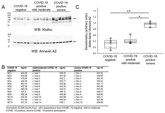 Western blot and densitometric analysis of klotho protein in uEVs from COVID-19-negative participants and COVID-19-positive participants. (A) Representative Western blot showing Klotho protein enrichment (top blot) in uEVs from COVID-19-negative participants, mild-to-moderate COVID-19-positive participants and severe COVID-19-positive participants. Representative Western blot of Annexin A2 protein enrichment (bottom blot) in these samples from the same blot was used to assess lane loading. (B) Table of uromodulin concentration in uEV preparations from COVID-19-negative participants, mild-to-moderate COVID-19-positive participants, and severe COVID-19-positive participants. (C) Densitometry analysis of Klotho protein enriched in uEVs normalized to annexin A2 protein expression. Box and whisker plots show the mean (dotted line) and median (solid line) for the data points. * represents a p-value < 0.05, ** represents a p-value < 0.01. n = 12 samples per group.