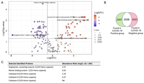Proteomic analysis of uEVs isolated from COVID-19 and non-COVID-19 patients. (A) Volcano plot of differentially expressed peptides/proteins in the COVID-19-negative participant and COVID-19-positive participant groups; the intensity bar on the right represents the degree of fold change of COVID-19-positive/COVID-19-negative and the size of the circles represents the significance of the fold change. MetaboAnalyst 6.0 software [19] was used to create the Volcano plot. (B) Venn diagram showing the number of peptides/proteins exclusively enriched in each group or common between the two groups. (C) Table showing a list of selected identified proteins enriched in uEVs from COVID-19-positive participants compared to uEVs from COVID-19-negative participants. The fold change threshold was set to 2.0 and the p-value threshold was set to 0.05.