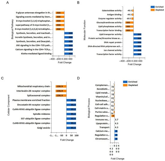 Bioinformatic analysis of the proteomic dataset from uEVs of COVID-19-negative participants and COVID-19-positive participants. (A) Biological pathway, (B) molecular function, (C) cellular component, and (D) biological process. n = 9 per group.