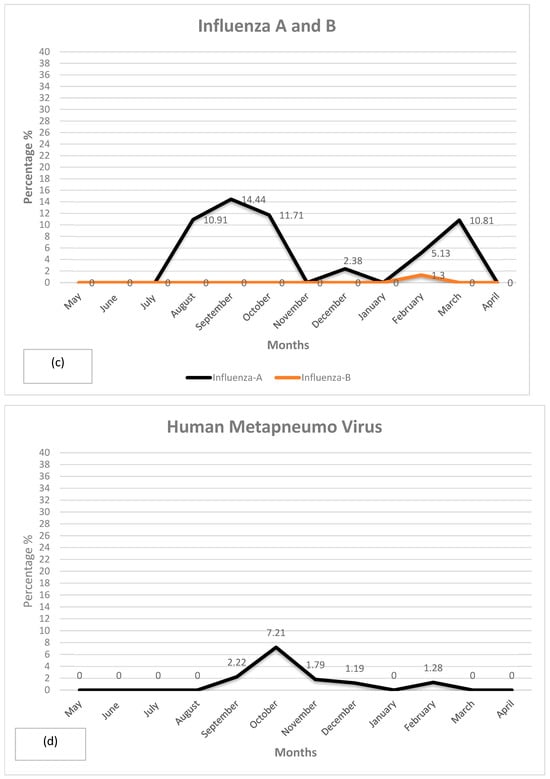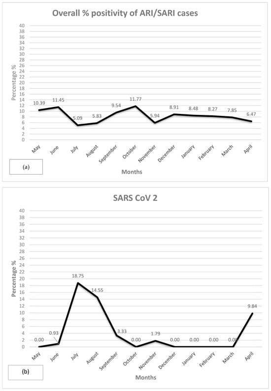 The overall positivity percentage of ARI/SARI cases peaks in July (11.45%), November (11.77%), and January (8.48%), with the lowest rate in June (0.09%) (Figure 1a). For SARS-CoV-2, the highest positivity rates occur in July (18.75%) and August (14.55%), with a resurgence in April (9.84%) following several months of low to no detection (Figure 1b). Flu-A and Flu-B show distinct patterns, with Flu-A peaking in August (14.44%) and December (11.71%), while Flu-B has a smaller peak in February (3.38%) (Figure 1c). hMPV reaches its peak in October (7.21%), with few to no cases detected in other months (Figure 1d). Significant activity is exhibited for RSV-B in October (28.57%), remaining relatively high through December (15.38%), while RSV-A shows smaller peaks in August (5.56%) and October (3.66%) (Figure 1e).