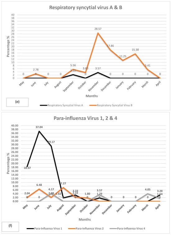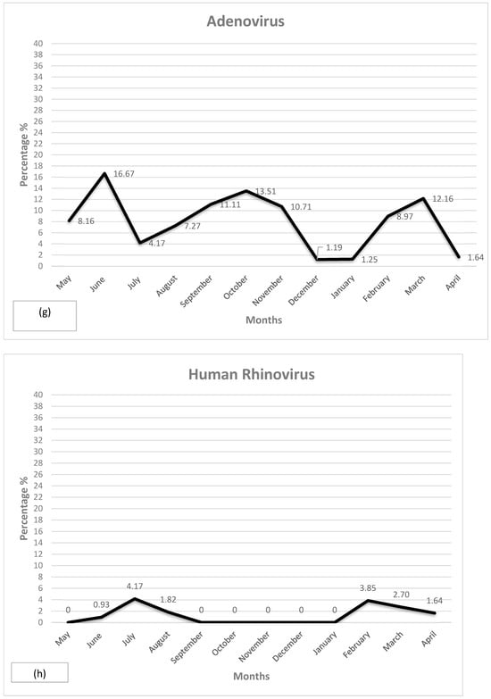 (a–h). Seasonal distribution of respiratory viral pathogens. (a) Overall % Positivity of ARI/SARI Cases–The positivity rate peaks in July (11.77%). (b) SARS-CoV-2–A high positivity rate is observed in July (18.75%) and August (14.55%), followed by a drop to 0% from October to March, with a small resurgence in April (9.84%). (c) Influenza A and B–Influenza A has two distinct peaks in October (14.44%) and April (10.81%), suggesting a bimodal seasonal pattern. Influenza B, with lower positivity, peaks in January (3.38%), showing less seasonal fluctuation. (d) Human Metapneumovirus–peaks in October (7.21%). The virus has minimal activity during most months, indicating a brief seasonal presence. (e) Respiratory Syncytial Virus (RSV) A & B–. RSV B shows a significant peak in October (28.57%), while RSV A has smaller peaks in September (5.56%) and March (4.10%), suggesting different seasonal patterns for each subtype. (f) Para-Influenza Virus 1, 2, & 4–Type 1 has a high peak in May (37.04%) with rapid decline afterward. Type 3 has a small peak in October (8.33%), while types 2 and 4 remain low throughout the months, indicating type-specific seasonality. (g) Adenovirus–Displays a fluctuating positivity rate for Adenovirus with peaks in August (16.67%) and January (11.11%), showing sporadic activity and scattered occurrences without a clear seasonal trend. (h) Human Rhinovirus–Shows the positivity rate of Human Rhinovirus, which remains low overall, with a small peak in October (4.17%) and slight increases in March (3.85%) and April (1.64%), indicating minor seasonal variations.
