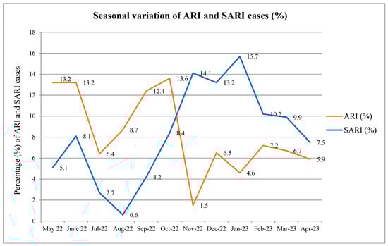 Seasonal distribution of ARI and SARI cases during May 2022–Apr 2023.