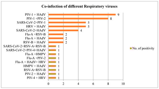 The findings of this study also support the positivity prevalence reported by another study [19], of 2.4% to 3.5% and 2% to 3.8% in SARI and ARI patients, respectively, if we matched the results with our age-group population. The rate of respiratory virus co-infections varied greatly between investigations worldwide [29,30,31]. A total of 46 (14.9%) co-infections were identified in the present study, which was lower than in a study of Rajasthan [22] and higher than in a pan-India study [19] in which they found 0.4% co-infections among SARI cases in children aged less than 5 years. The highest co-infection in our study was seen with HAdV and PIV (56.5%). Other co-infections were with SARS-CoV-2 (23.9%), followed by Flu-A and HRV (15.2%), RSV (13.0%), and hMPV (4.3%). When the characteristics of mono-infected and co-infected patients were compared, it was found that co-infected SARI patients were more likely to have seizures (O.R. (95% C.I.) 17.2 (1.4–207.1); p-value 0.02), require continuous positive air pressure (CPAP) (O.R. (95% C.I.) 3.4 (0.9–12.3); p-value 0.05), and use bronchodilators (OR (95% C.I.) 4.2 (0.7–25.6); p-value 0.13). Mortality in co-infected SARI patients was greater than in mono-infected SARI patients (O.R. (95% C.I.) 2.4 (0.6–9.3); p-value 0.20).