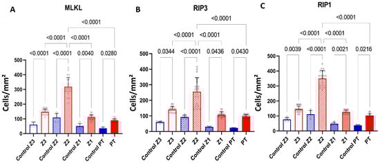 Quantitative analysis of MLKL (A), RIP3 (B) and RIP1 (C) in zones Z3, Z2, Z1 and PT in the liver parenchyma of fatal cases of human YF compared to negative control.