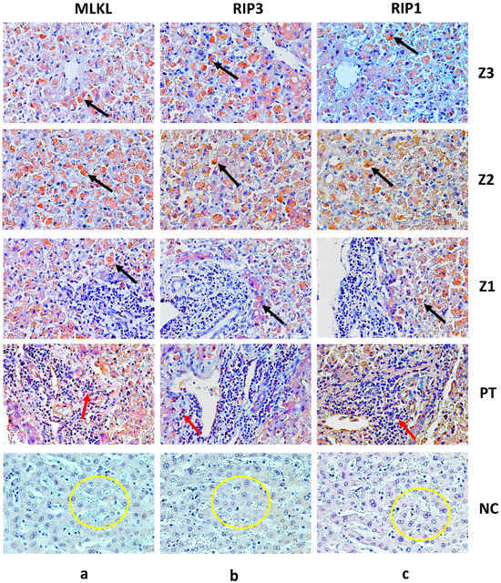Immunostaining for MLKL (Z3-a, Z2-a, Z1-a), RIP3 (Z3-b, Z2-b, Z1-b) and RIP1 (Z3-c, Z2-c, Z1-c) in hepatocytes (black arrow) and PT-a, PT-b and PT-c in inflammatory infiltrates (red arrow). Preservation of hepatic parenchyma in control cases and minimal expression of MLKL (a), RIP1 (b) and RIP3 (c) (yellow circle). Magnification of 400× (scale: 20 μm). Z3: Centrilobular zone; Z2: midzonal zone; Z1: periportal zone; PT: portal tract; NC: normal control.