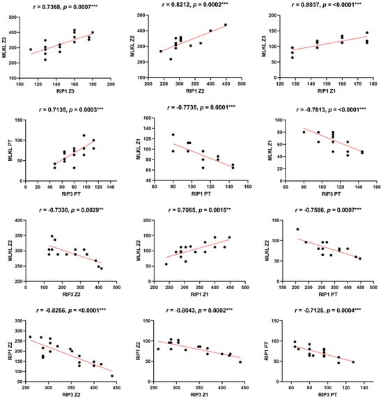 Linear correlations among markers of necroptosis in fatal yellow fever cases of moderate to strong correlation. Pearson correlation: *** p < 0.0001; ** p < 0.001; * p < 0.05.