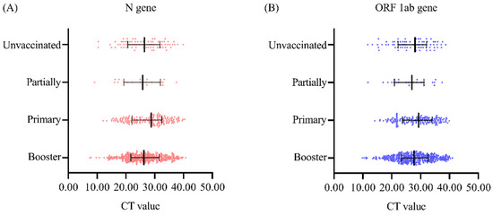 Comparison of nucleic acid Ct values in individuals with SARS-CoV-2 according to vaccination status (A) Ct value of the N gene. (B) Ct value of the ORF1ab gene.