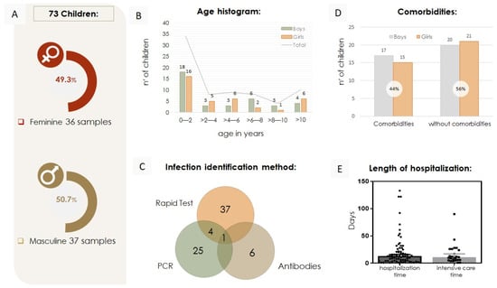 Percentage and age of infected boys and girls with or without comorbidities, hospitalization duration, and diagnosis methods. (A) Percentage of children by sex out of 73 samples. (B) Age histogram of infected children, showing boys and girls separately, from 0–2, > 2–4, >4–6, >6–8, > 8–10, and >10 years old. The most vulnerable age group was under 2 years old. (C) Methods employed to diagnose SARS-CoV-2 infection in the samples studied. (D) A total of 73 infected children, boys, and girls, with or without comorbidities. (E) The median length of hospitalization and intensive care stay, was 21 and 16 days, respectively.
