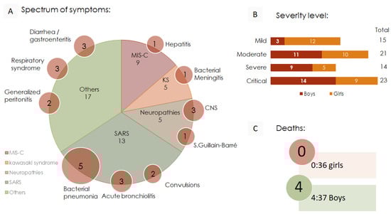 Clinical evolution and severity analysis in pediatric COVID-19. (A) Spectrum of symptoms in 73 children. The symptoms presented with multiple simultaneous manifestations. The red circles indicate the number of symptoms overlapping with the primary diagnosis. Primary diagnoses included MIS-C (multisystem inflammatory syndrome in children), Kawasaki syndrome (KS), neuropathies in SARS-CoV-2-positive infections (CNS = central nervous system), SARS (severe acute respiratory syndrome), and others, each presenting a wide variety of clinical symptoms. (B) Severity level according to the PODIUM [37] hospital classification. (C) Number of deaths and their frequencies within each sex (number of deaths–number of samples).