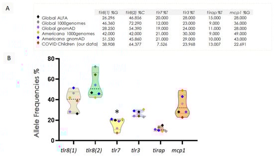 Comparative analysis of SNPs allelic frequencies in pediatric COVID-19 hospitalizations. (A) Five public database references of random populations and our work group’s percentage of SNPs from tlr8 (1), tlr8 (2), tlr7, tlr3, tirap, and mcp1. (B) Allelic frequency of the polymorphisms found in the 73 samples from hospitalized children with COVID-19 compared to (A). In dashed lines, the violin plot shows the media and the first and third quartiles. * Statistically significant frequency differences were observed from the four database groups (except for Global 1000 genomes) to tlr7.