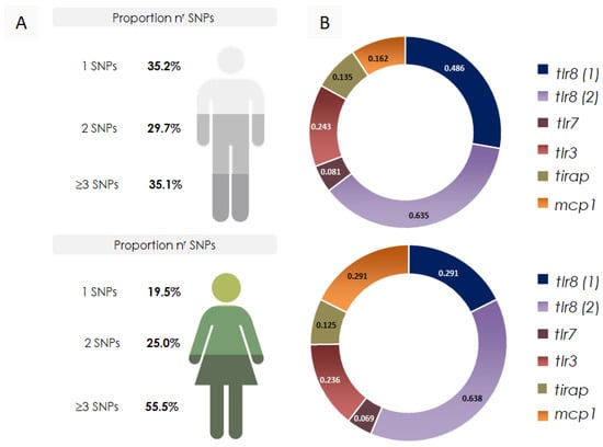 Our frequency analyses were categorized for comparative analysis by sex (Figure 4). Cumulative frequency data show that girls had more SNP alleles than boys (≥3 SNPs, 55.55% vs. 35.1%, respectively). The comparison of SNP frequencies by sex revealed the most significant differences for the SNPs tested in tlr8 (1) and mcp1. Subsequently, we showed that tlr8 (1) was associated with severe symptom cases. However, mcp1 showed an inconsistent distribution, even when analyzed alongside other data.