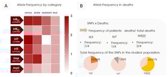 The distribution of SNPs’ frequencies was analyzed according to the symptom severity category, as depicted in Figure 5. It was observed that there was an increase in color intensity in more severe symptom cases for SNPs tlr8 (1), tlr7, tlr3, and tirap. The SNP tlr8 (1) showed a proportional gradient relative to symptom severity. In contrast, tlr7, tlr3, and tirap had an SNP frequency distribution primarily concentrated in the severe and critical symptom categories. Notably, tlr7 was almost exclusively present in the severe and critical symptom categories, with only one case identified in the mild symptom category, which involved a heterozygous girl. For the SNPs tlr8 (2) and mcp1, frequencies appeared randomly distributed across the categories, with varying intensities observed among different symptom severity levels. Regarding fatal cases, one of four individuals had the mutation for tlr7, one for tlr3, and two for tlr8 (2). These data, along with the total frequency distribution of these SNPs found in fatalities, have been included in Figure 5B to assess the probability of these occurrences being random or statistically significant.