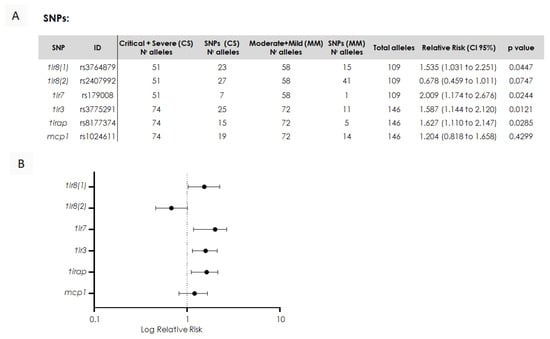 Association between SNPs and severity of symptoms in children with COVID-19. (A) Contingency that displays relative risk values with a confidence interval and p values between allele numbers in severe + critical symptom groups compared to allele numbers in the mild + moderate symptom group. (B) Forest plot showing the relative risk and 95% confidence interval for the presence of the mutation in the severe + critical symptom groups compared to the mild + moderate symptom group. Plots to the right of the dashed line indicate a positive association, and those to the left indicate a negative association; those crossing the dashed line indicate no association.
