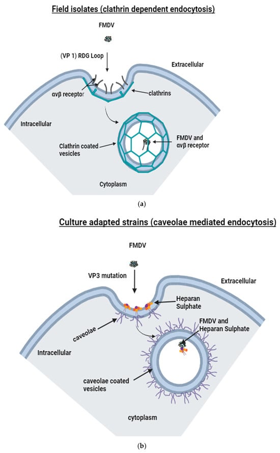 Although FMDV infection is primarily facilitated by the RGD motif, it is nevertheless possible for infection to occur independently of the RGD motif [8]. Cell-surface glycosaminoglycan (GAG) molecules have been linked to infections by cell culture-adapted FMDV strains. Heparan sulphate proteoglycan (HSPG) is a specific type of GAG that serves as a secondary receptor for cell culture-adapted FMDV by caveolae-mediated endocytosis [20,21]. The process is facilitated by caveolin, which are flask-shaped indentations in the plasma membrane as well as the lipid rafts, and cholesterol [20]. After FMDV enters cells by caveolae-mediated endocytosis (Figure 1b), it then moves with endosomes by taking advantage of communication within the caveolae-to-endosome transport pathway [22].