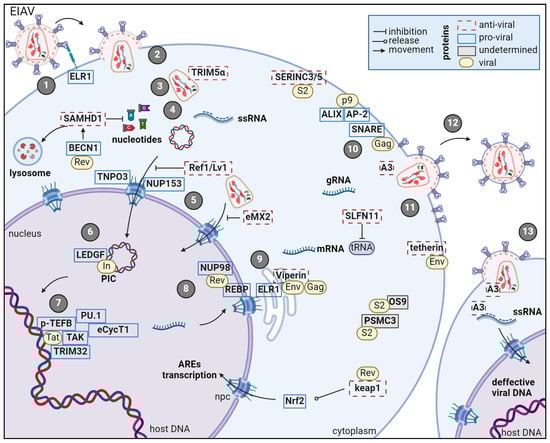 - Wang, X.-F.; Zhang, X.; Ma, W.; Li, J.; Wang, X. Host Cell Restriction Factors of Equine Infectious Anemia Virus. Virol. Sin. 2023, 38, 485–496. [Google Scholar] [CrossRef]