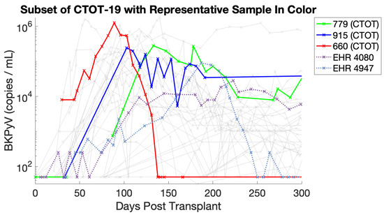 A subset of patients was drawn from the full datasets for this work. Table 3 and Table 4 show how patients were chosen for our subset. A representative sample of four patients with peak BKPyV loads above and below copies/mL occurring before 300 days post-transplant is considered, two patients from each cohort. An additional patient with higher viral load concentrations ( copies/mL) and earlier presentation ( days post-transplant) is chosen to further demonstrate model flexibility. Most transplant patients do not present with BKPyV; patients with a moderate peak viral load are chosen because (A) some initial virus must be present to start an infection in the model and (B) since fixed immunosuppression treatment is assumed, treatment for these patients should not change substantially, similar to a fixed treatment. We consider patients who peak before day 300 since BKPyV infection is most common within the first year and for reasonable computation times [2]. The two patients chosen from the EHR cohort are denoted and , and the two patients from the CTOT-19 study are called #287779 and #287915 (anonymized IDs). The final CTOT-19 patient with a high, early peak is designated . In Figure 2, see that these five patients cover the chosen subset and demonstrate the model’s viability in the group of interest.