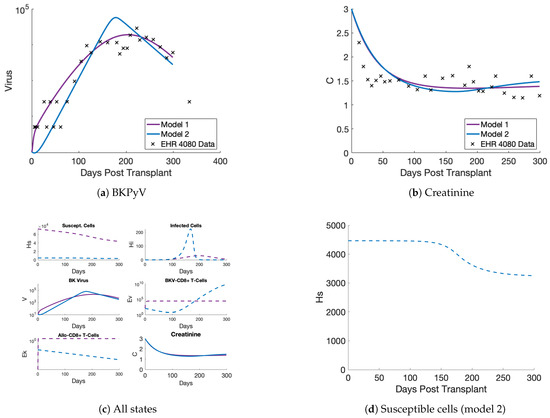 Focusing on the model 2 fit in Figure 3, we see that the model fits BKPyV and creatinine data well. The model captures the climb in viral load around 100 days post-transplantation, when we have our first measurement over the limit of detection. (Note that there are two limits of detection, corresponding to different laboratories’ analyses of samples.) The model does over-estimate the peak viral load, but the tail of the infection is captured well. The creatinine state falls, as expected, immediately after transplant when the new kidney clears creatinine efficiently, and after a few months, the creatinine dynamics flatten out. Figure 3c shows all the states of the model after being fit to BKPyV and creatinine measurements. In the top left panel, notice that susceptible kidney cells () start at different amounts for the models due to the estimation of the initial value (). (This is acceptable, since susceptible cell concentrations of a donor organ are unknown and initial cell concentrations vary greatly among adults [37].) Behavior of the dynamics for are more important than the quantity of susceptible cells. In contrast to model 1’s (purple) steady fall of in Figure 3c, Figure 3d zooms in onmodel 2 (blue), showing a more stable susceptible cell population as it plateaus. Slow loss and a fairly level trajectory for susceptible cells indicates longer graft life. Pairing this behavior with the low constant creatinine level indicates the organ is still healthy using model 2. Also, the infected cells and BKPyV-specific T cells on the right-hand side follow the viral increase as expected. Overall, model 2 performs better than model 1 in the non-viral states while also being a simpler, more biologically focused model than previous versions.