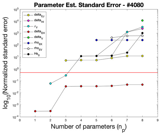 Parameter estimate subset selection based on standard errors for patient #4080. Each number of parameters indicates the best standard errors for a subgroup of that size. The red line indicates where standard errors are greater than their respective parameter values. For patient #4080, at best two parameters can be estimated with acceptable standard errors: and . Estimating all eight parameters, as shown in Table 6, only has a single parameter with respectable standard error.
