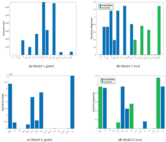 Identifiable parameters are shown in green in the graphs on the right side of Figure 5. Note that our parameter identification algorithm relies on the local sensitivity analysis, so no green bars appear in Figure 5a,c. The set of identifiable parameters for model 1 are , , , , shown in green in Figure 5b. The identifiable parameters for model 2 are . These are not the same parameters that are identifiable in model 1, but both model 1 and model 2 have four identifiable parameters, so there is no loss of identifying information induced by the model changes.
