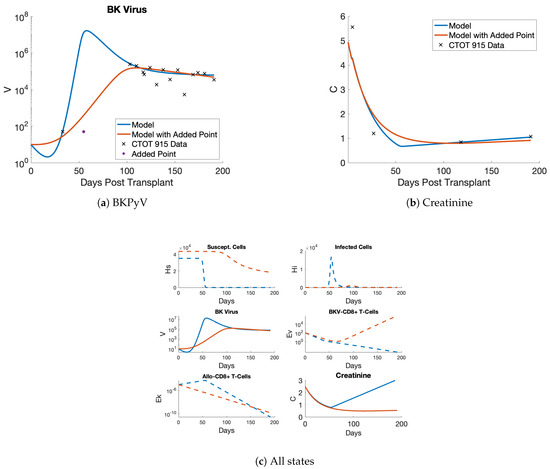 Model 2 fit to CTOT patient #287915 data. (a) The original model fit (blue) to the data displays a very early and strong BKPyV infection; the results of which would most likely lead to BKPyV nephropathy (BKPyVAN). For the model fit in red, a simulated data point is added to the dataset and results in more biologically realistic dynamics. (b) Limited creatinine data were available, but they are captured well by both models. (c) All states of the model are shown with both trajectories, where those in blue demonstrate an allograft lost to BKPyVAN, and others in red show a damaged but still functioning organ.