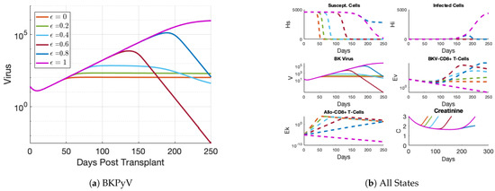With the purpose of developing and calibrating the model, we chose a simple fixed value for the drug efficacy parameter, . In Figure 7, the parameter was varied over six fixed values starting at 0 (no immune suppression) and ending at 1 (complete immune suppression). For the model to achieve the viral loads observed in patient data (greater than ), greater than 0.6 was necessary; see Figure 7a. Choosing slows the loss of the susceptible tubule cell concentration shown in the top left panel of Figure 7b indicating a close-to-balanced treatment level. This also corresponds with clinicians’ approach of prescribing high-efficacy immunosuppression treatments following the transplantation to prevent acute rejection of the graft.