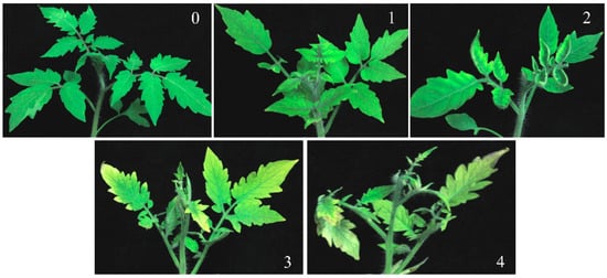 The severity rating scale for tomato yellow leaf curl virus (TYLCV) symptoms in tomato plants. The scale is defined as follows: 0 = asymptomatic; 1 = slight symptoms, characterized by mild yellowing of leaflet margins on apical leaves; 2 = moderate symptoms, with some yellowing and minor curling of leaflet ends; 3 = severe symptoms, marked by marginal or interveinal yellowing and curling of leaves, along with a noticeable reduction in plant size; 4 = very severe symptoms, including extreme yellowing, curling, and stunting, which ultimately halt its growth.