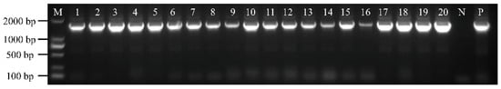 TYLCV infection rates in tomato plants displaying disease symptoms in the field. M: DNA marker; 1–20: 20 individual tomato plants with leaves exhibiting varying degrees of yellowing and curling in the field; N: negative control (healthy tomato leaf); P: positive control (TYLCV-infected tomato leaf).