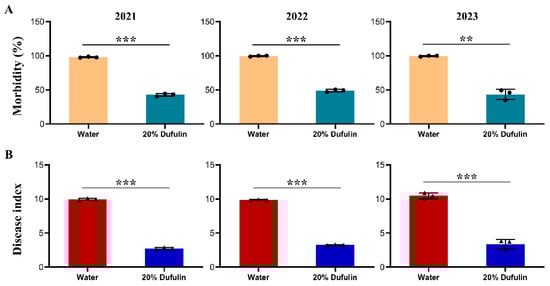 The morbidity and disease index of tomato plants in field experiments from 2021 to 2023. (A) The morbidity; (B) the disease index. Data were pooled with three replications; Data are given as mean ± SD; the asterisks above bars mean significant difference: ** p < 0.01, *** p < 0.001.