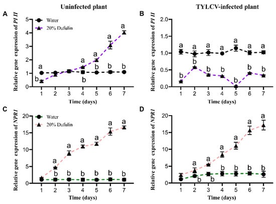 The relative expression level of PI II and NPR1 in tomato plants after spraying with 20% dufulin and water for days 1, 2, 3, 4, 5, 6, and 7. (A,C): In uninfected tomato plants. (B,D): In TYLCV-infected tomato plants. Data were pooled with three replications; Data are given as mean ± SD. Different letters indicate significant differences (p < 0.05).