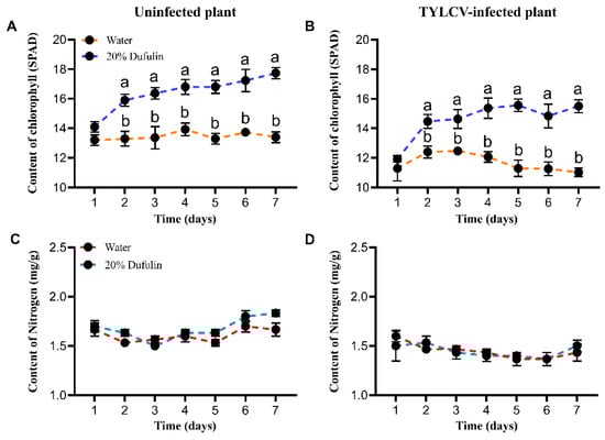 The content of chlorophyll (SPAD) and nitrogen (mg/g) in tomato plants after spraying 20% dufulin and water for days 1, 2, 3, 4, 5, 6, and 7. (A,C): In uninfected tomato plants. (B,D): In TYLCV-infected tomato plants. Data were pooled with three replications; Data are given as mean ± SD. Different letters indicate significant differences (p < 0.05).