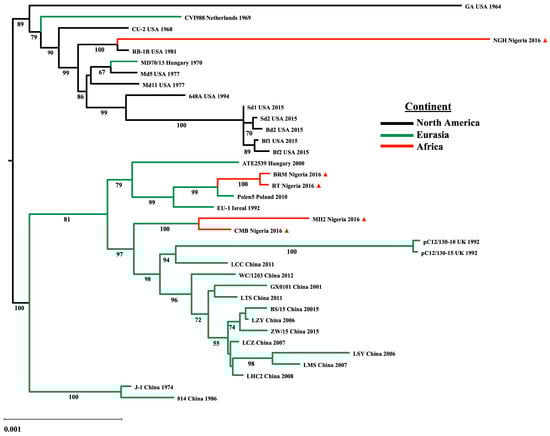 To determine the phylogeographic relationship and evolutionary lineage of the emergence of new Nigerian field isolates, we built phylogenetic trees using the maximum likelihood approach. MDV genomes are divergent in that the direction of evolution is presumably driven by constraints related to the co-divergence of virus and host lineages, including the differences in international vaccination practices, poultry breeding and genetics, and management practices. According to previous phylogenetic and comparative genomic analysis, the reconstruction of MDV phylogeny based on complete or partial genomes suggests that North American and Eurasian stains emerged from independent evolutionary paths [,,].