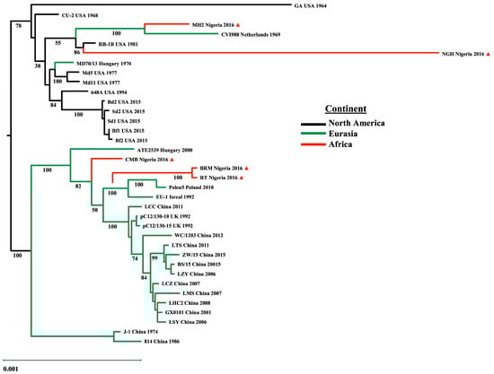 We performed sequence alignments on the genomes of 36 international MDV isolates collected between 1964 and 2016 from NA, Europe, Asia, and West Africa. The partial genomes of the Nigerian field isolates present a limitation within our phylogenetic analysis. However, MDV sub-genomic segments can give insight into evolutionary dynamics, where the phylogenetic trees based on the UL subregion support the construction of phylogeny based on complete genomes [,]. To account for inaccurate inferences of phylogeny, we also constructed a phylogenetic tree based on sequences of the UL sub-region.