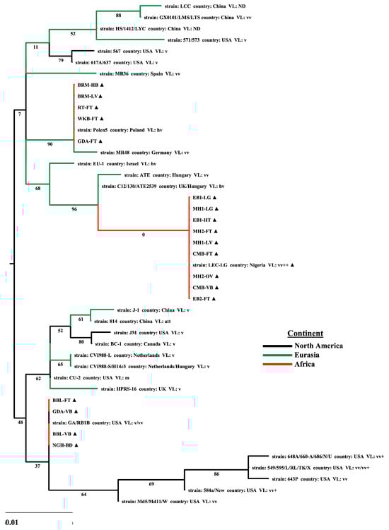 The construction of unrooted phylogenetic trees reveals the monophyletic grouping of strains into NA and Eurasian clades (Figure 1). Within this geographical framework, MH2, CMB, BRM, and RT were grouped with the other Eurasian strains into a clade, whereas NGH clusters in the NA clade due to close genetic relations with the RB1B strain. MH2 and CMB genomes have close genetic relatedness, as do BRM and RT genomes; accordingly, these genomes cluster with recently isolated strains from Europe (Hungary, Israel, and Poland) in the European subclade. The latter two genomes cluster with European strains and share a more recent common ancestor with the hv Polish strain, Polen5 (Figure 1). Notably, MH2 and CMB genomes constitute a distinct subclade separate from BRM, RT, and other Eurasian strains, implying the Nigerian field strains could have evolved independently. Because of the paucity of MDV genomes sequenced from Western Africa, we could not determine if the Nigerian strain conforms to a clade associated with Afro-Eurasia.