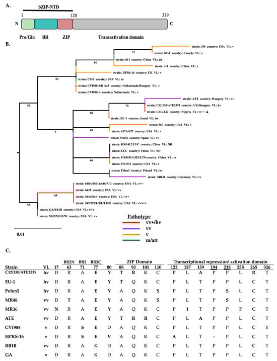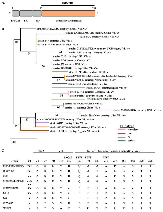 The viral oncogene meq has a central role in the pathogenesis of MDV infection, in which the gene encodes a 339 amino acid (aa) basic leucine zipper (bZIP) transcription factor (TF) in most virulent US strains, although due to variations in the number of proline-rich repeats (PRRs), 398/399 aa isoforms are found in lower virulence (BC-1, JM16) and mixed isoforms in CVI988 vaccine stocks []. Meq not only has a causal role in oncogenicity [] mediated through bZIP interactions including the dimerization with the putative binding partner, NFIL3 as shown by Reinke et al. [], but our group and others have identified virulence-associated mutations in the meq gene in a pathotype and regionally-dependent manner, but our group and others have identified virulence-associated mutations in the meq gene in a pathotype and regionally-dependent manner [,,,]. Based on these observations, the meq gene appears to undergo strong positive selection pressures, with specific mutations mapping to the C-terminal domain (CTD). It remains unclear, however, how these mutations in meq provide a mechanistic basis for changes in virulence and vaccine-induced immune evasion.