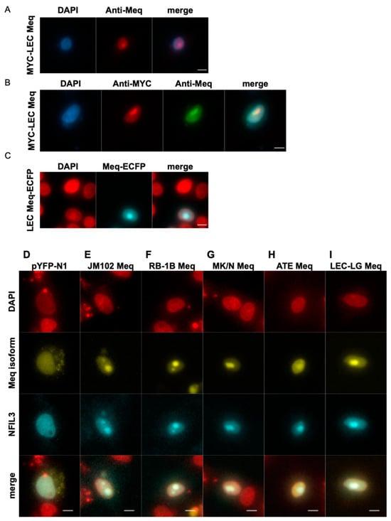 For the localization study, HD11s were transiently transfected with 200 ng of the LEC-LG meq expression vectors (pBKCMV-MYC-Meq or pECFP-N1-MYC-Meq) per well in a 12-well plate. After 24 h, transfected cells were fixed with 1% paraformaldehyde in PBS for 30 min, followed by three washes with PBS. Cells were blocked for 1 h in blocking buffer (1× PBS, pH 7.4, 3% goat serum, 1% BSA, 0.1% saponin, 0.1% NaN3) prior to staining with the polyclonal antibody to Meq (rabbit serum) or the mouse anti-MYC epitope tag antibody (9E10 hybridoma supernatant) for 2 h at RT. Cells were washed three times with wash buffer (1× PBS, pH 7.4, 1% BSA, 0.1% NaN3), and incubated for 1 h with the appropriate secondary antibody (goat anti-mouse IgG, whole molecule Alexa 555 or 568, as noted; or goat anti-rabbit IgG, whole molecule Alexa 488 or 568, as noted). Finally, cells were washed three times, as described above and counterstained with DAPI imaging buffer (1× PBS, pH 7.4, 10% glycerol, 6 nM DAPI, 0.1% NaN3). Image acquisition was performed with a Nikon Eclipse TE2000-U inverted epifluorescent microscope with a Plan Fluor 20× objective, Nikon Digital Sight DS-QiMc camera, and Nikon NIS Elements imaging software (v5.02).