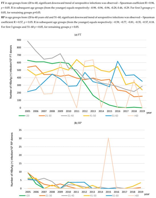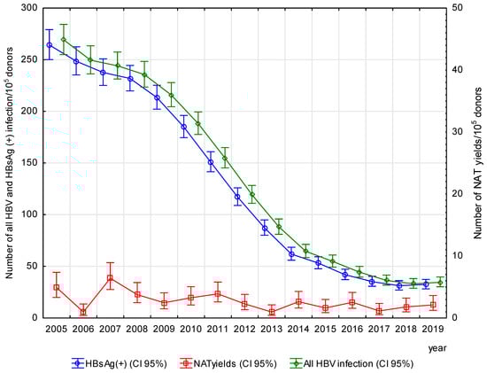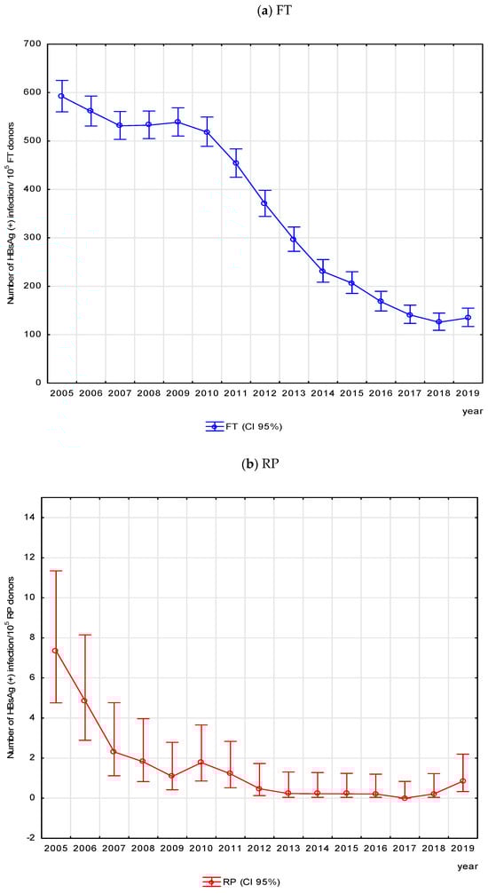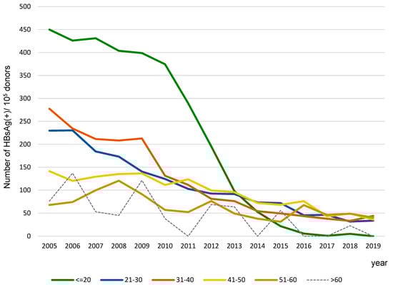 Kopacz, A.; Kubicka-Russel, D.; Liszewski, G.; Sulkowska, E.; Chrzanowska, A.; Zwolińska, P.; Noceń, E.; Potępa, A.; Łętowska, M.; Grabarczyk, P.; et al. Hepatitis B Virus in Polish Blood Donors in the Period 2005–2019—Significant Changes in Epidemiology and Demographic Characteristics of Infected Donors. Viruses 2025, 17, 60. https://doi.org/10.3390/v17010060